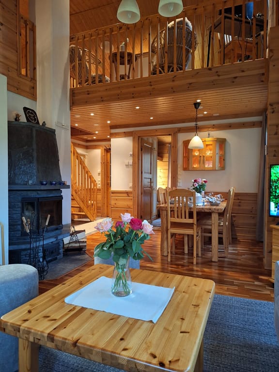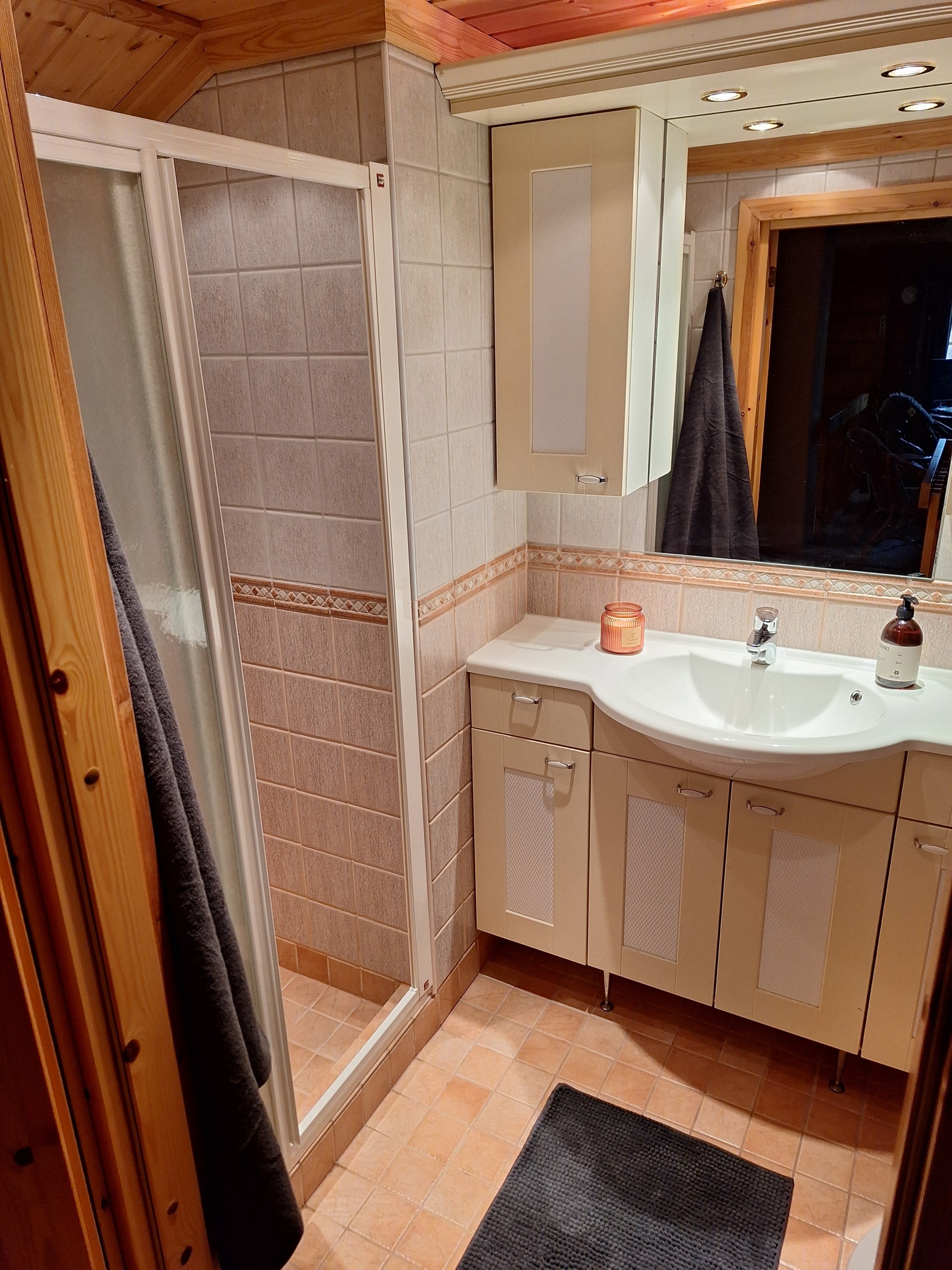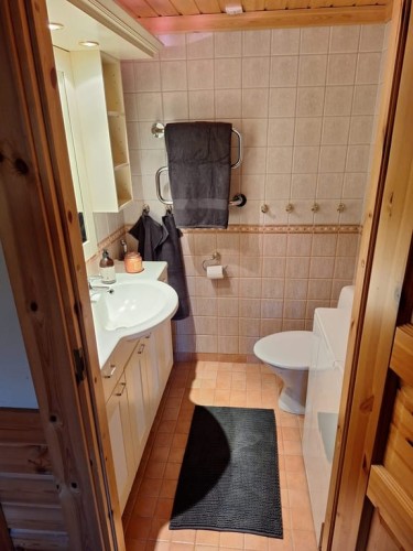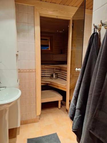 Die Sauna verfügt über einen Heti-Valmis-Ofen. Im Obergeschoss befinden sich außerdem ein geräumiges Badezimmer mit WC, drei Handtuchheizkörper, beheizte Spiegel im Badezimmer, Haartrockner, Bügeleisen und ein Trockenschrank.