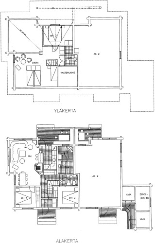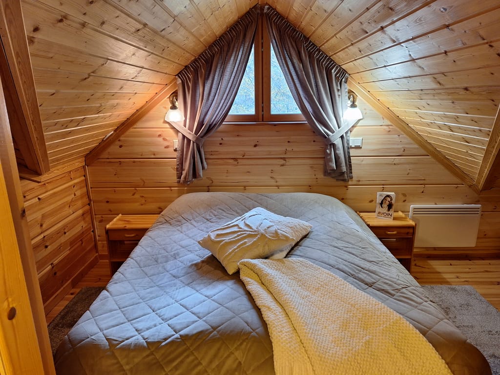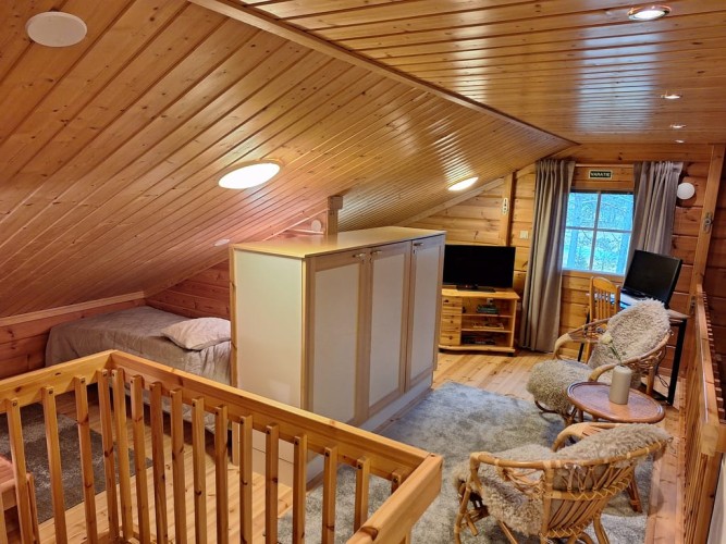 Kätkänpesä: Ruhige Lage, 9 Betten, 3 Schlafzimmer mit Doppelbetten und 2 Schlafemporen im Obergeschoss mit insgesamt 3 Betten.