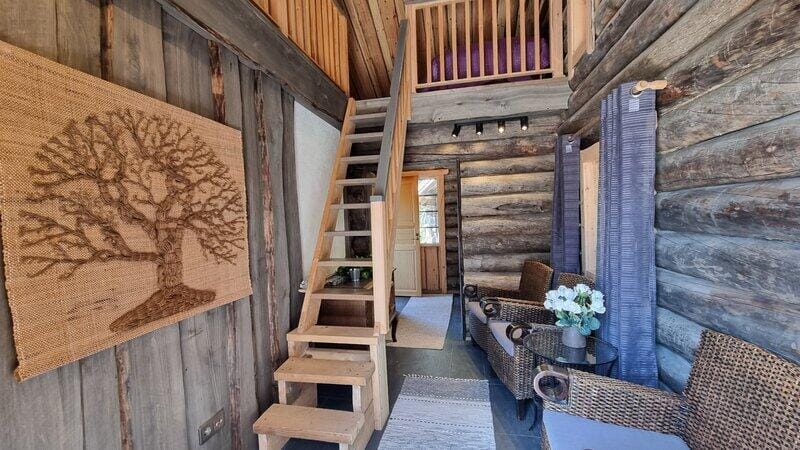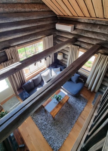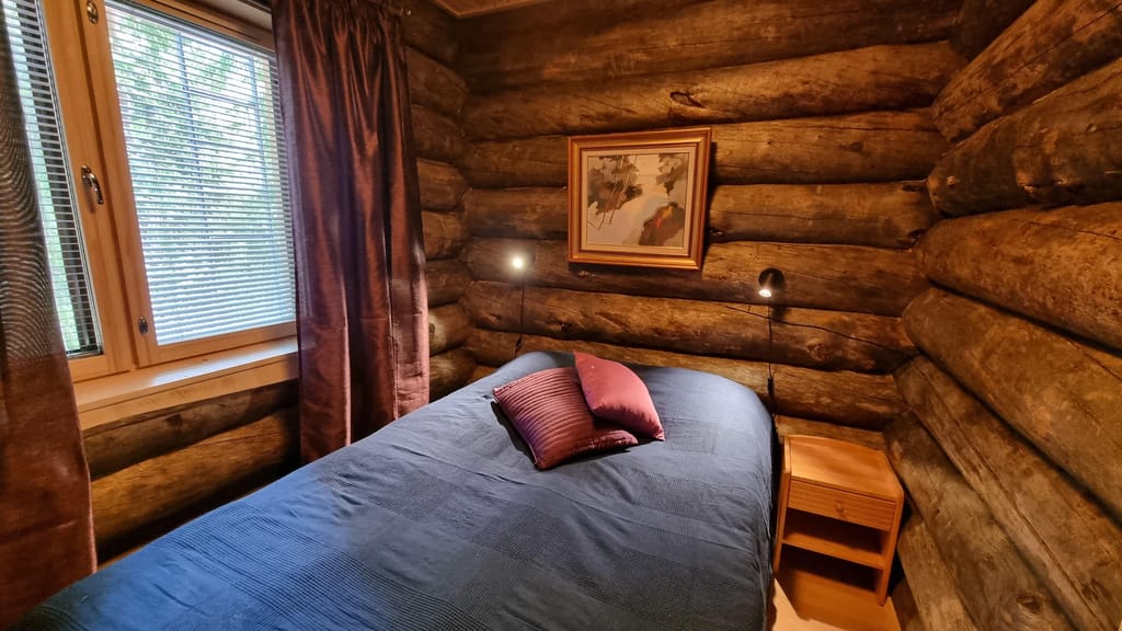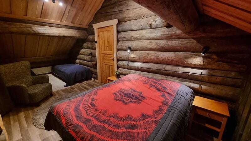 Beide Häuser verfügen über Schlafbereiche, Dusche und WC. Das Saunagebäude bietet vier Einzelbetten auf dem Schlafboden, während das Haupthaus drei separate Schlafzimmer für insgesamt 8 Personen bietet. Im Erdgeschoss befindet sich ein Schlafzimmer mit einem 140 cm breiten Hochbett. Im Obergeschoss befinden sich zwei größere Schlafzimmer: eines mit zwei 90 cm breiten Betten und das andere mit vier 80 cm breiten Betten. Einige Betten stehen nebeneinander. Der Zugang zum Obergeschoss erfolgt über eine relativ steile Treppe.