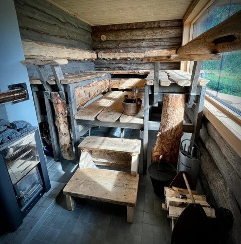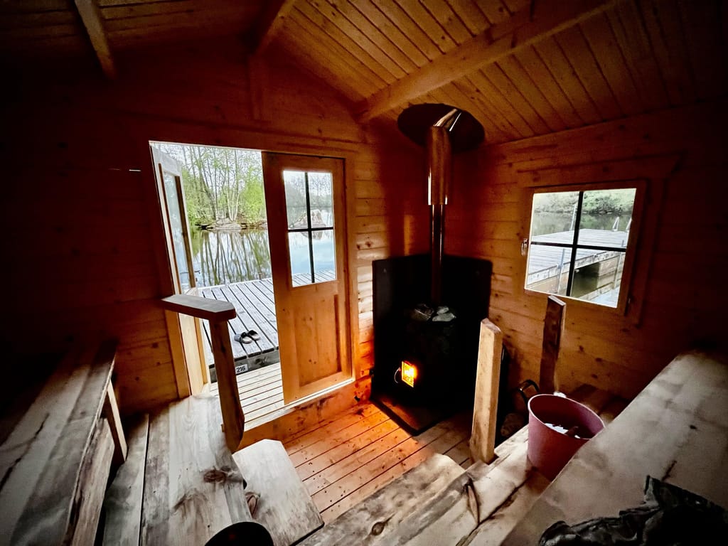 Das Ferienhaus verfügt über eine große, holzbefeuerte Sauna mit herrlichem Blick auf den Fluss. Angrenzend an die Sauna befindet sich ein Badezimmer mit Zugang zur Terrasse und zum Whirlpool.