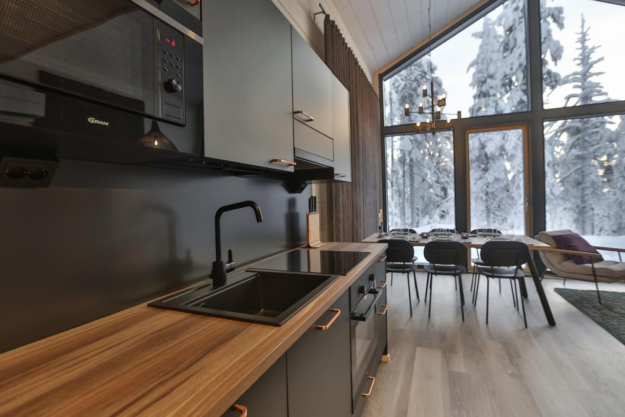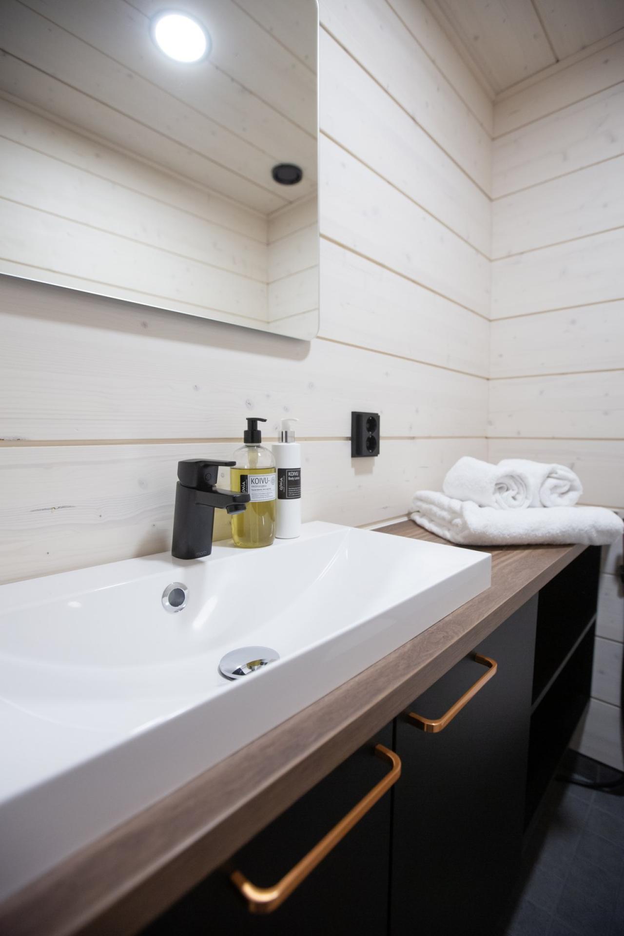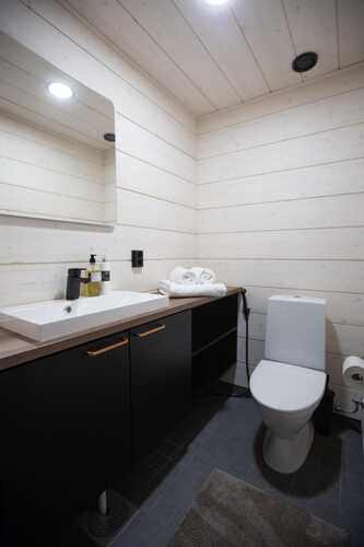 Tilava avoin olohuone-keittiö kutsuu rentoutumaan ja viettämään laatuaikaa yhdessä elämyksellisen päivän jälkeen. Valmista illallinen rauhassa, nauti viihtyisästä tunnelmasta tai rentoudu luonnon rauhassa. Oma sauna on täydellinen tapa päättää aktiivinen päivä, sillä kylpyhuoneessa on suihku ja wc saunan vieressä. Lisäksi huvilassa on erillinen wc, joka lisää mukavuutta. Oma terassi on ihanteellinen raikkaasta aamuilmasta nauttimiseen tai Lapin iltavalojen ihailuun.