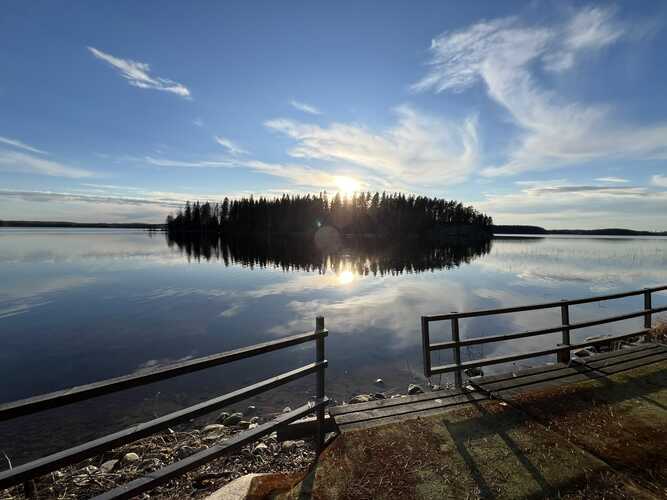 Mökillä on oma hiekkaranta, joka sopii erinomaisesti uimiseen ja rentoutumiseen. Ilta-aurinko maalaa järvimaiseman kauniin lämpimäksi – täydellinen hetki saunan jälkeen.