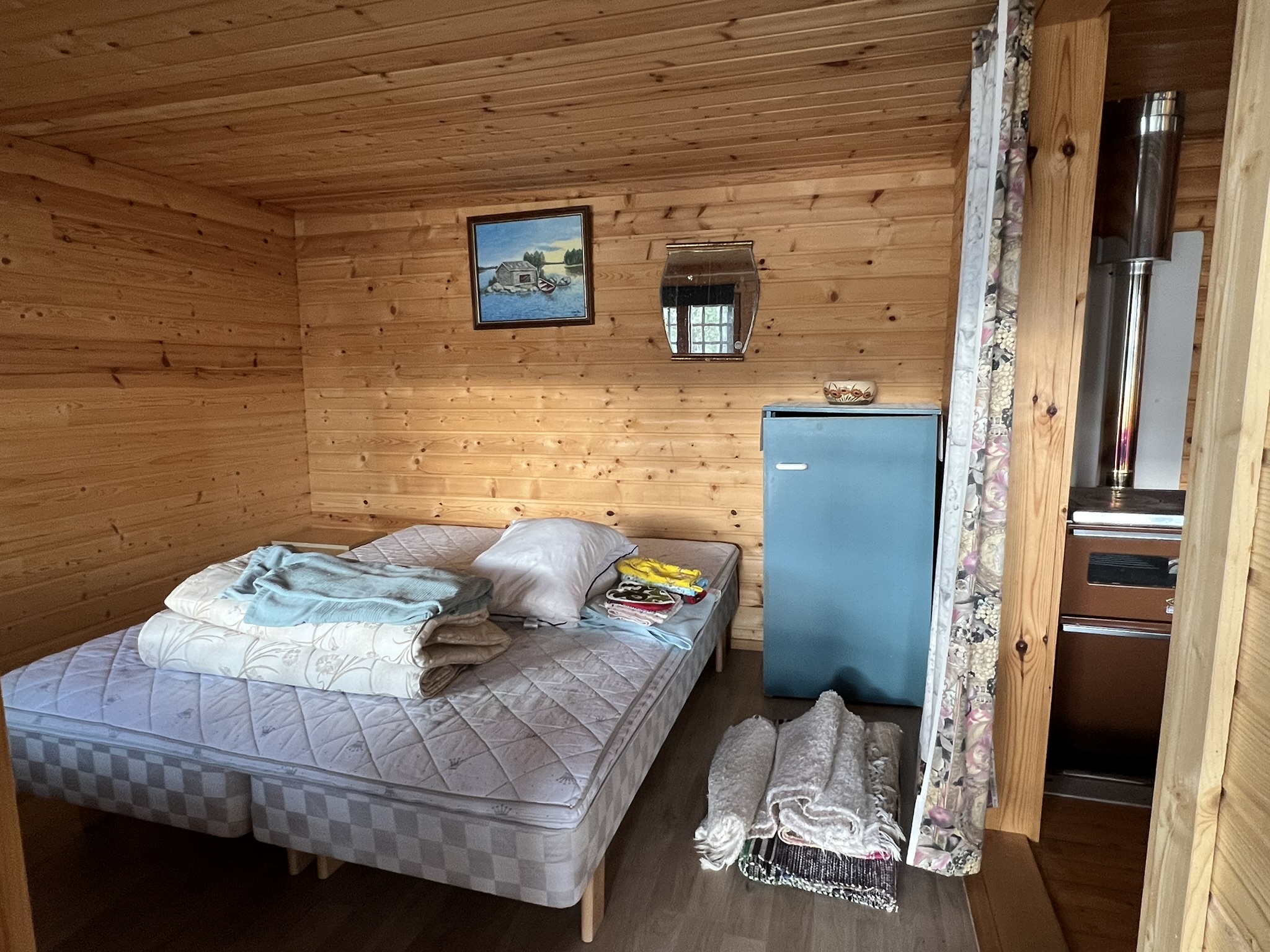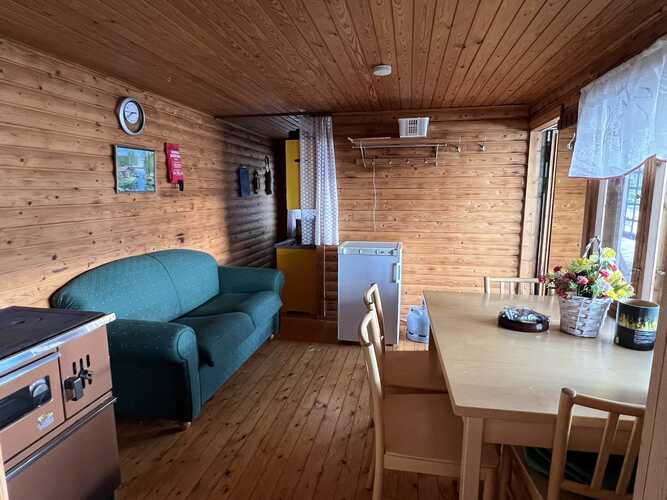 Noin 40 m² mökissä on makuuhuone, jossa parisänky, sekä olohuone, jossa levitettävä sohva lisämajoitusta varten.